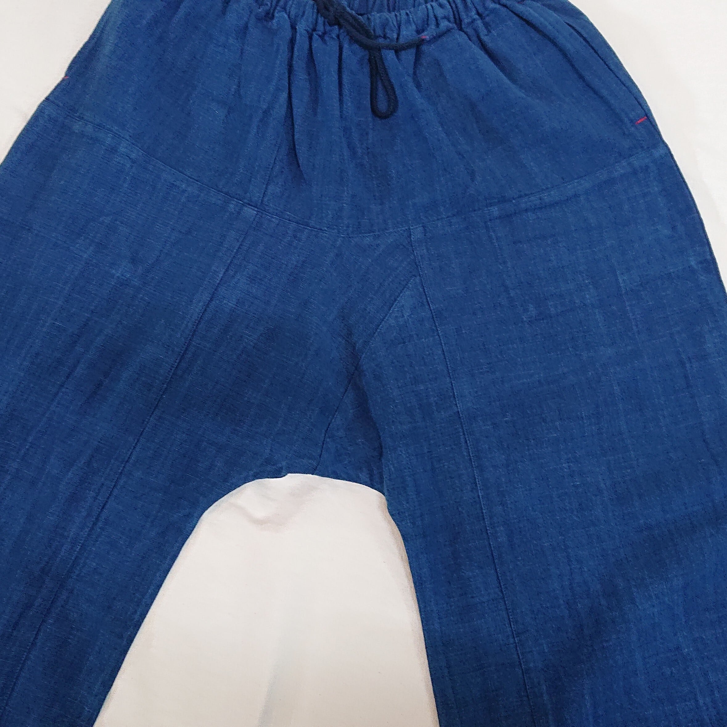 切り替えの入った特徴的なデザインのボトム、ムエタイパンツ。履くとすっきりとしたシルエットの一枚です。素材はタイ北部・チェンマイ県にあるホート群にて作られている生地。手紬手織りの為、均一でない独特な織りムラや温かみのある風合い。柔らかく肌触りの良いアイテムです。