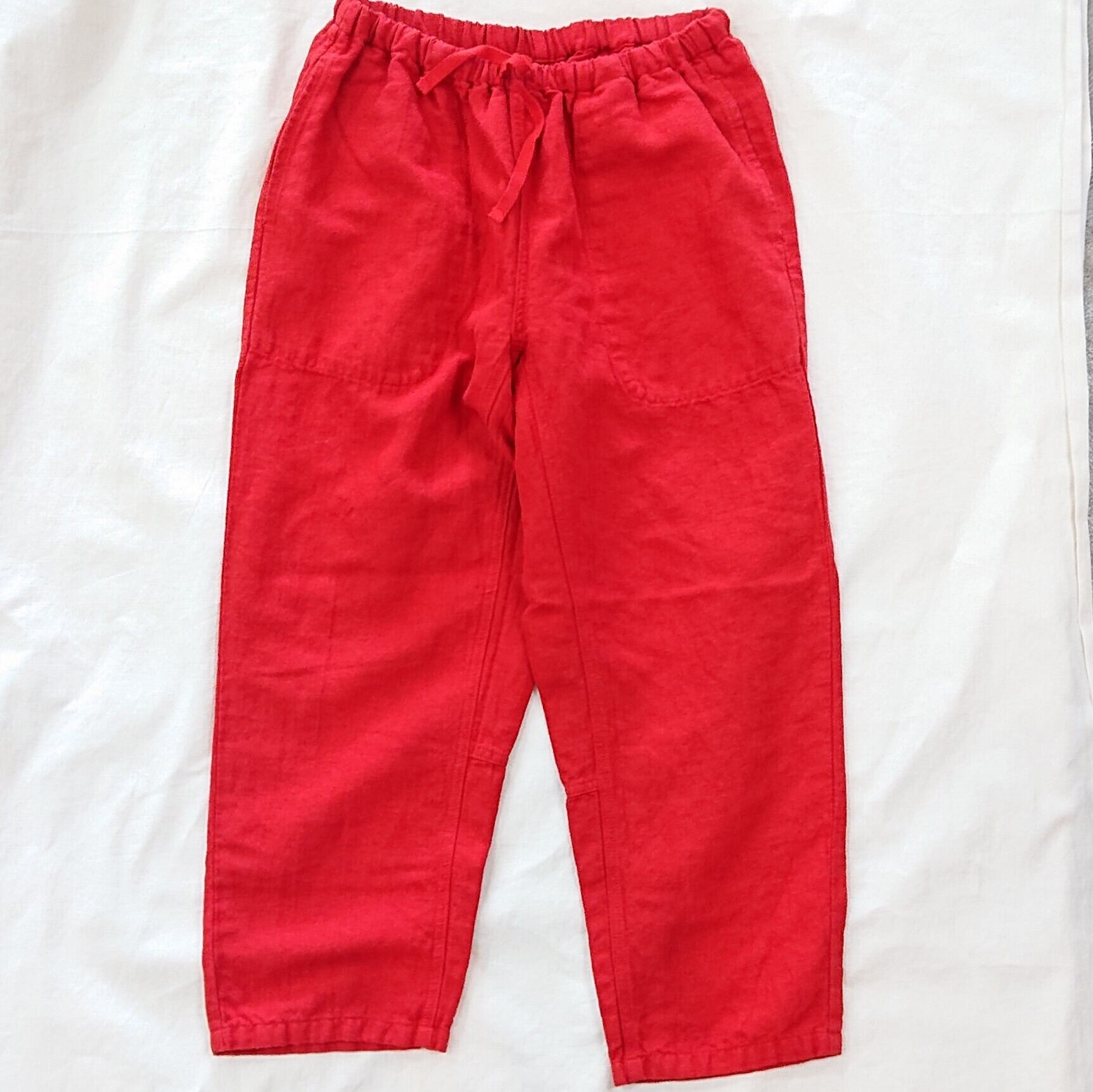 優しく柔らかなコットンリネン素材のタゴサクパンツ。ラミー混糸で細かい糸ムラの入ったしっかり丈夫で程よくカジュアルな生地感です。