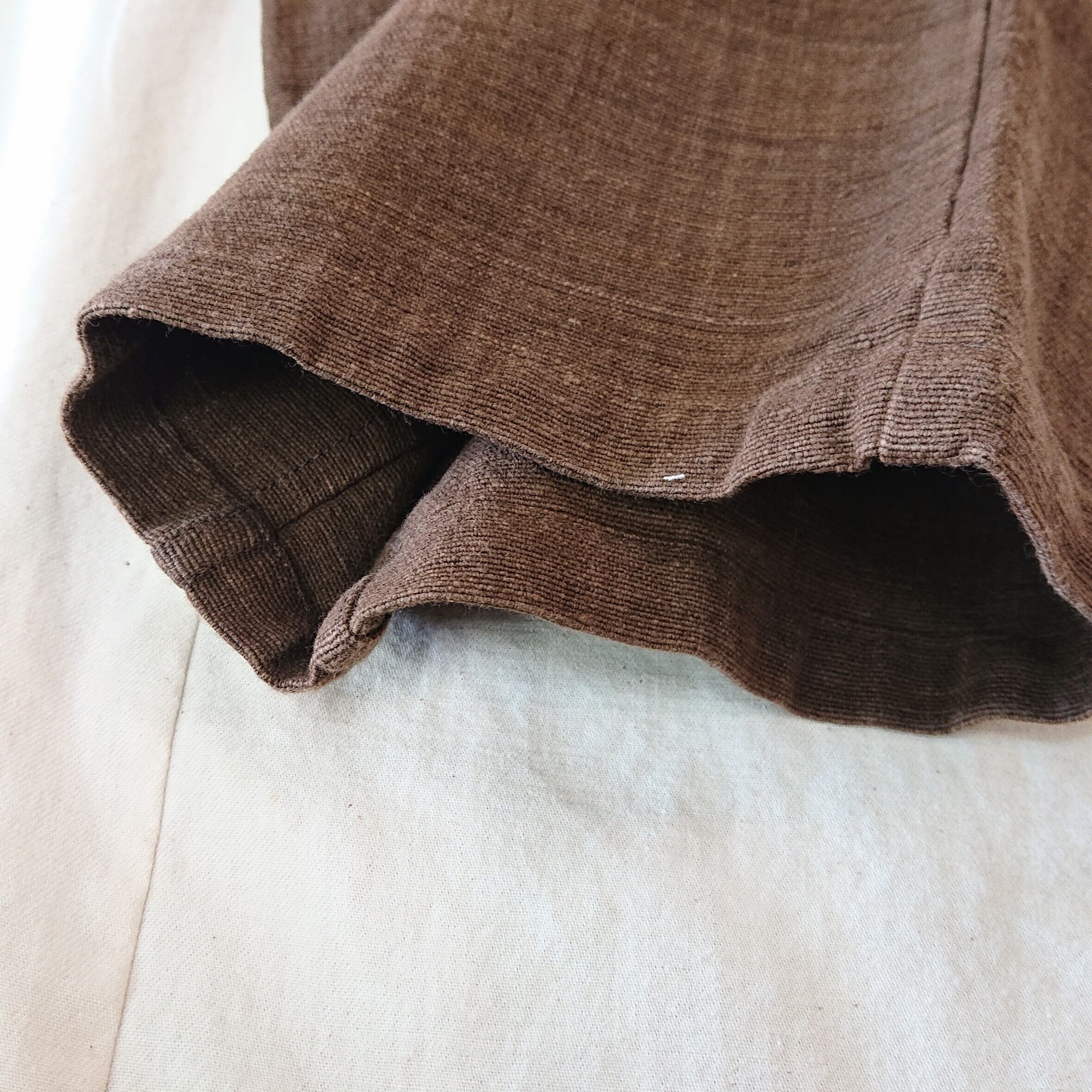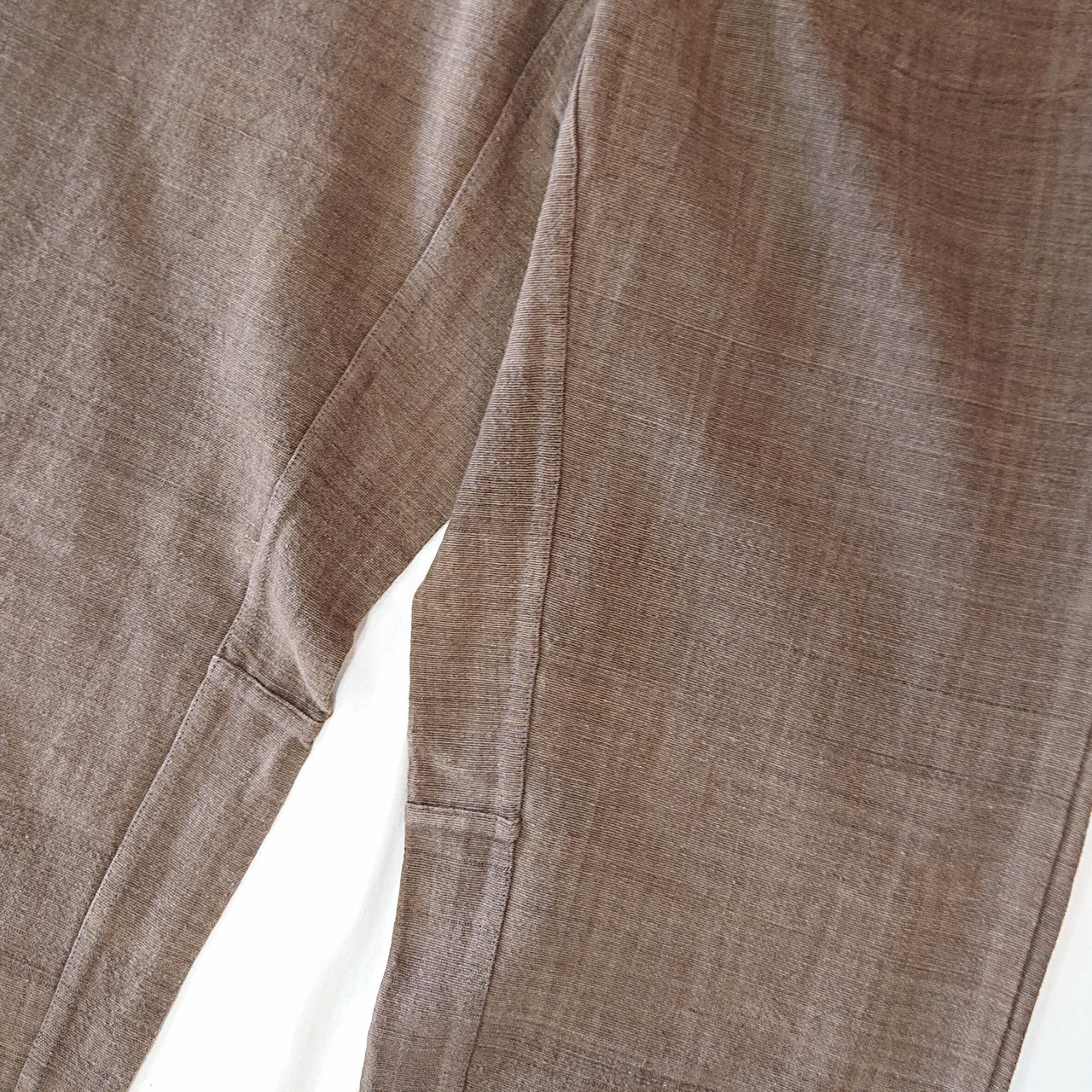 タイ北部・チェンマイ県にあるホート郡にて昔ながらの手織りで作られるマグアシリーズ。手紬手織りのため、均一で無い独特な織りムラや温かみのある風合いが特徴です。手織りで1日に7〜8m程ゆっくり織られています。糸は現地の草木染め。マグア(黒壇)の木の実を使用し、ブラウンに染めており、1日に1回しか行えず、糸染にも時間がかかる、かせ染を行っています。形は定番のタゴサクパンツをご用意しました。手織りで作られる風合いをお楽しみください,