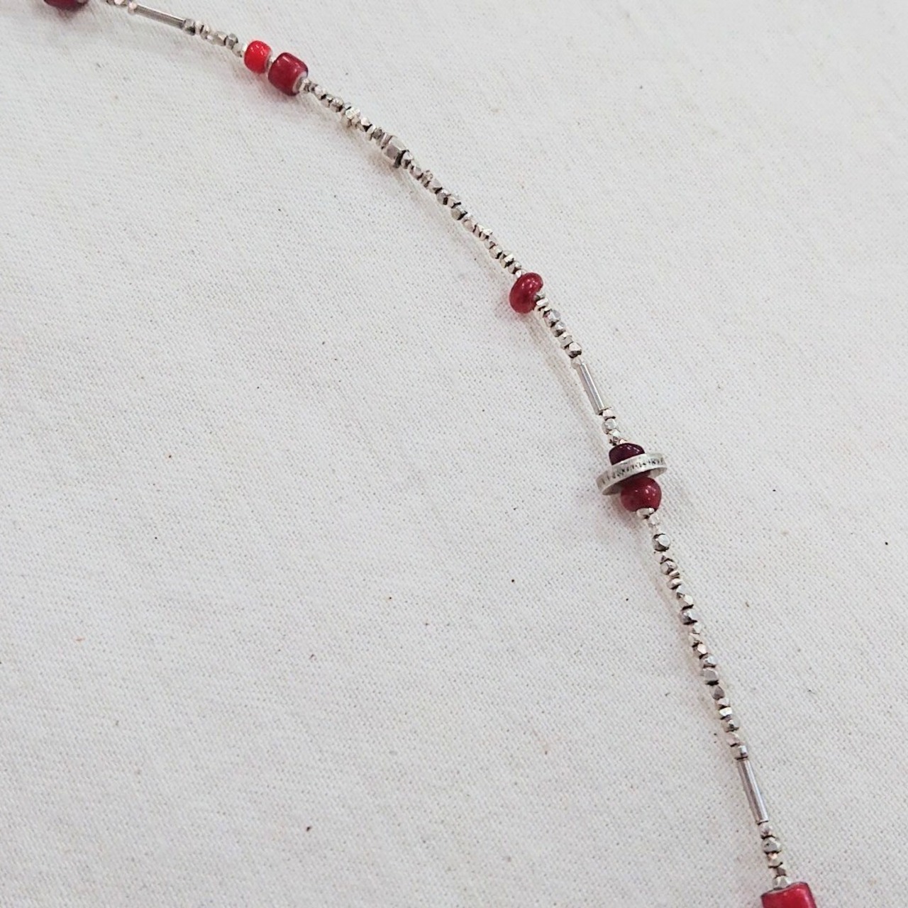 100年〜150年前のオールドグラスビーズやビルマ、タイのビーズ、カレンシルバーを組み合わせたロザリオネックレス。お好みの長さで楽しむことのできる、オリジナルのアクセサリーです。一つ一つ表情が異なり、温かみのあるビーズの質感をお楽しみください。夏に向けてのコーディネートのアクセントに。オリジナル生地で作った小物入れがアソートで付いています。