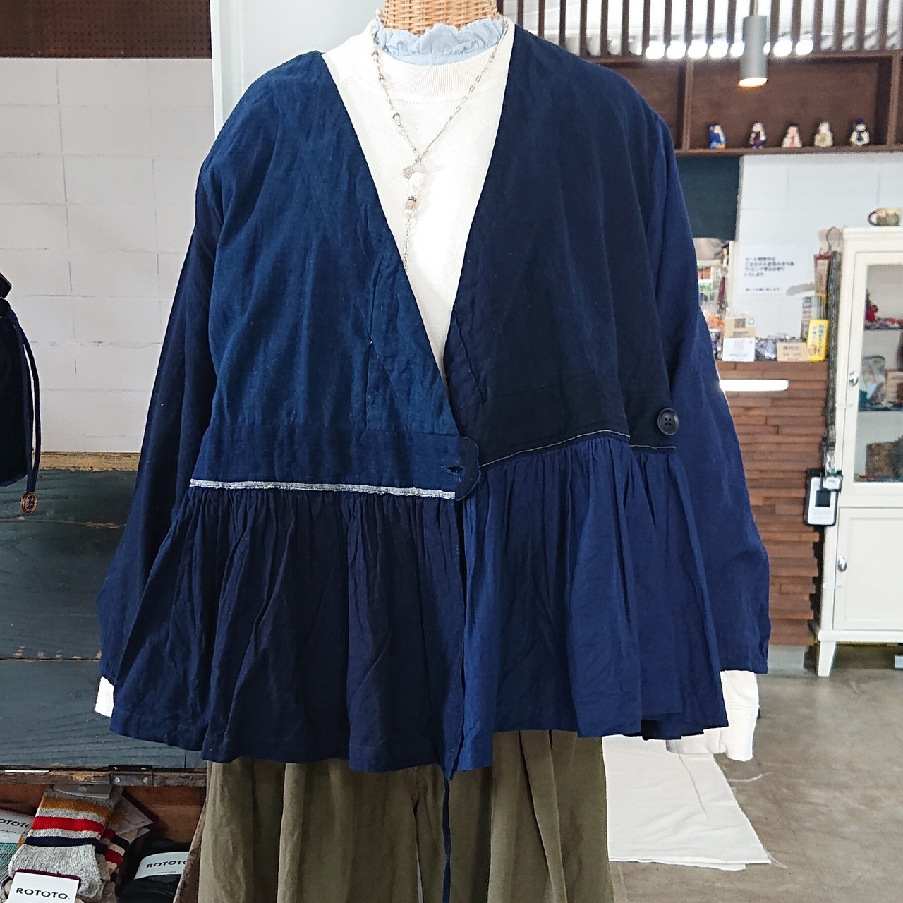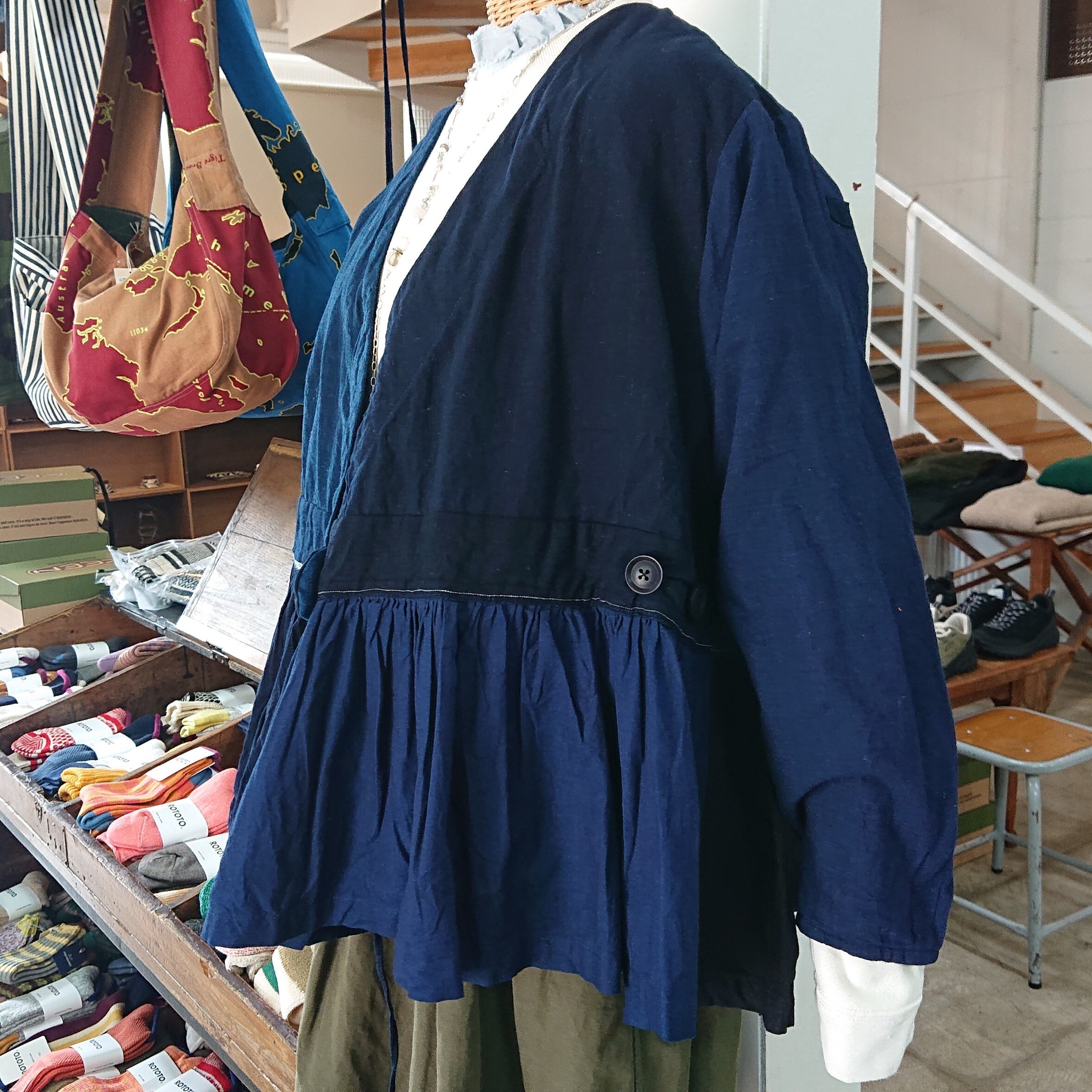 糸の芯まで染まりきって定着したその色は、心の奥底を掴むような深い、深い、大和色。"インディゴブルー"とはまた違う、日本的な色彩です。新しい型のベルトギャザーチュニック。カシュクールタイプ。