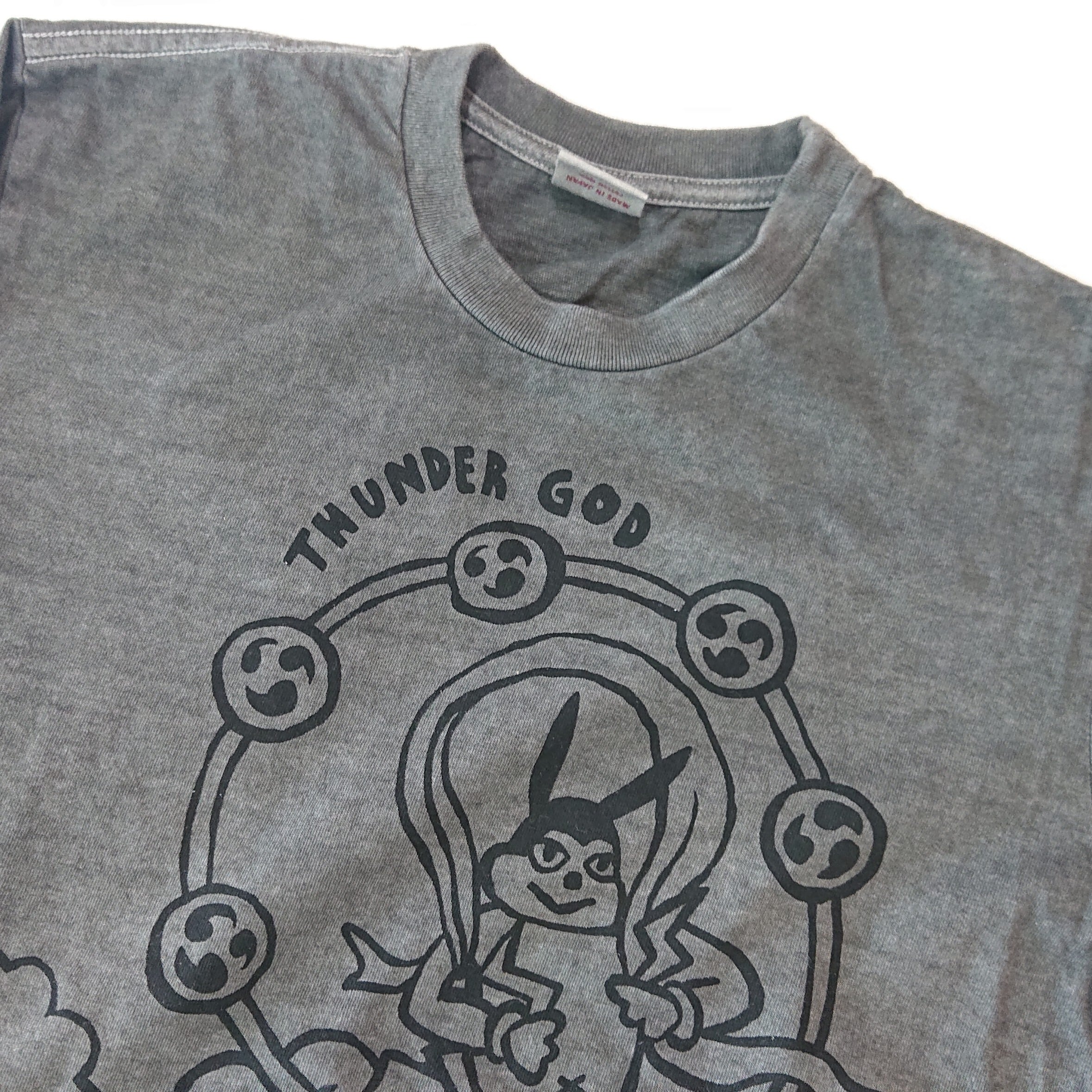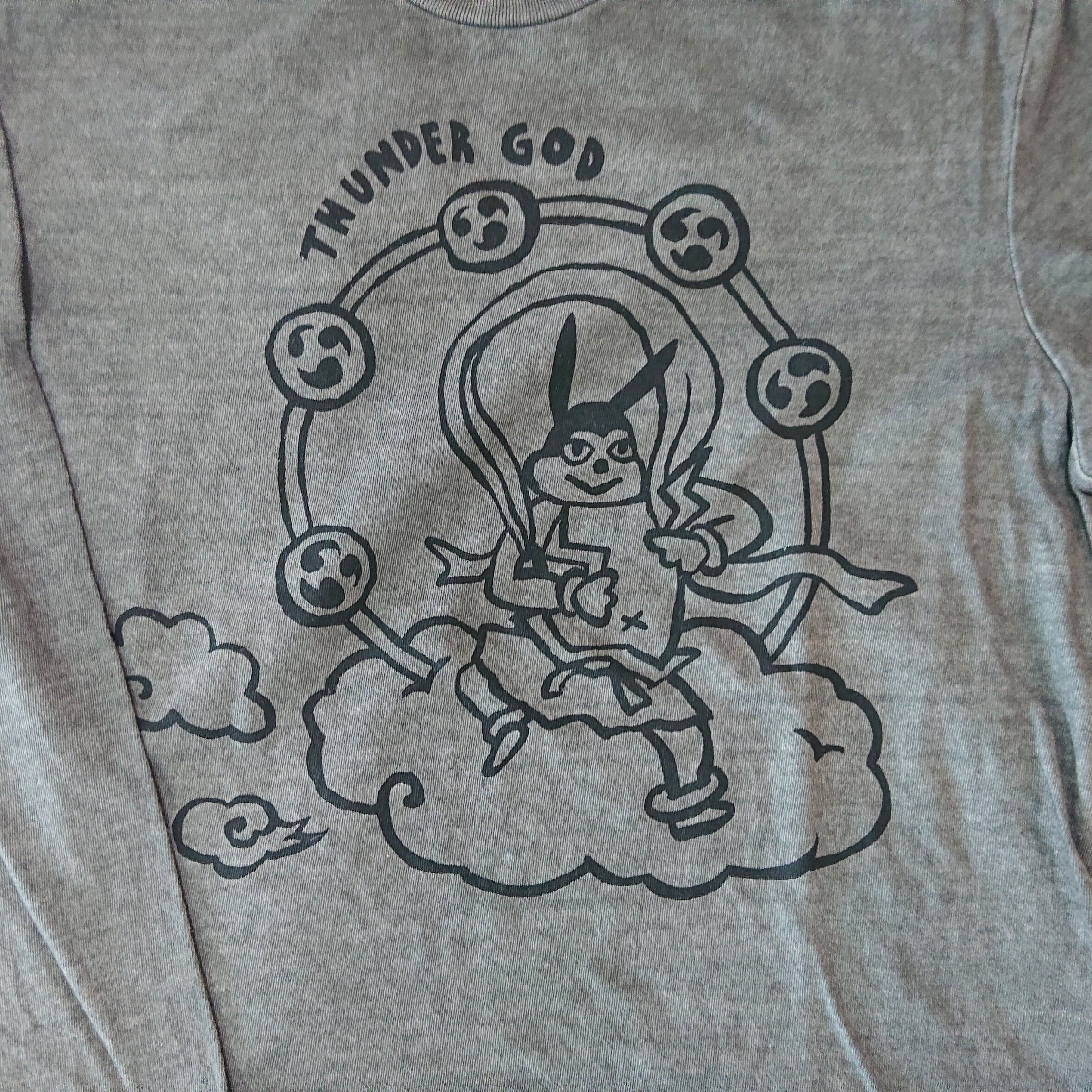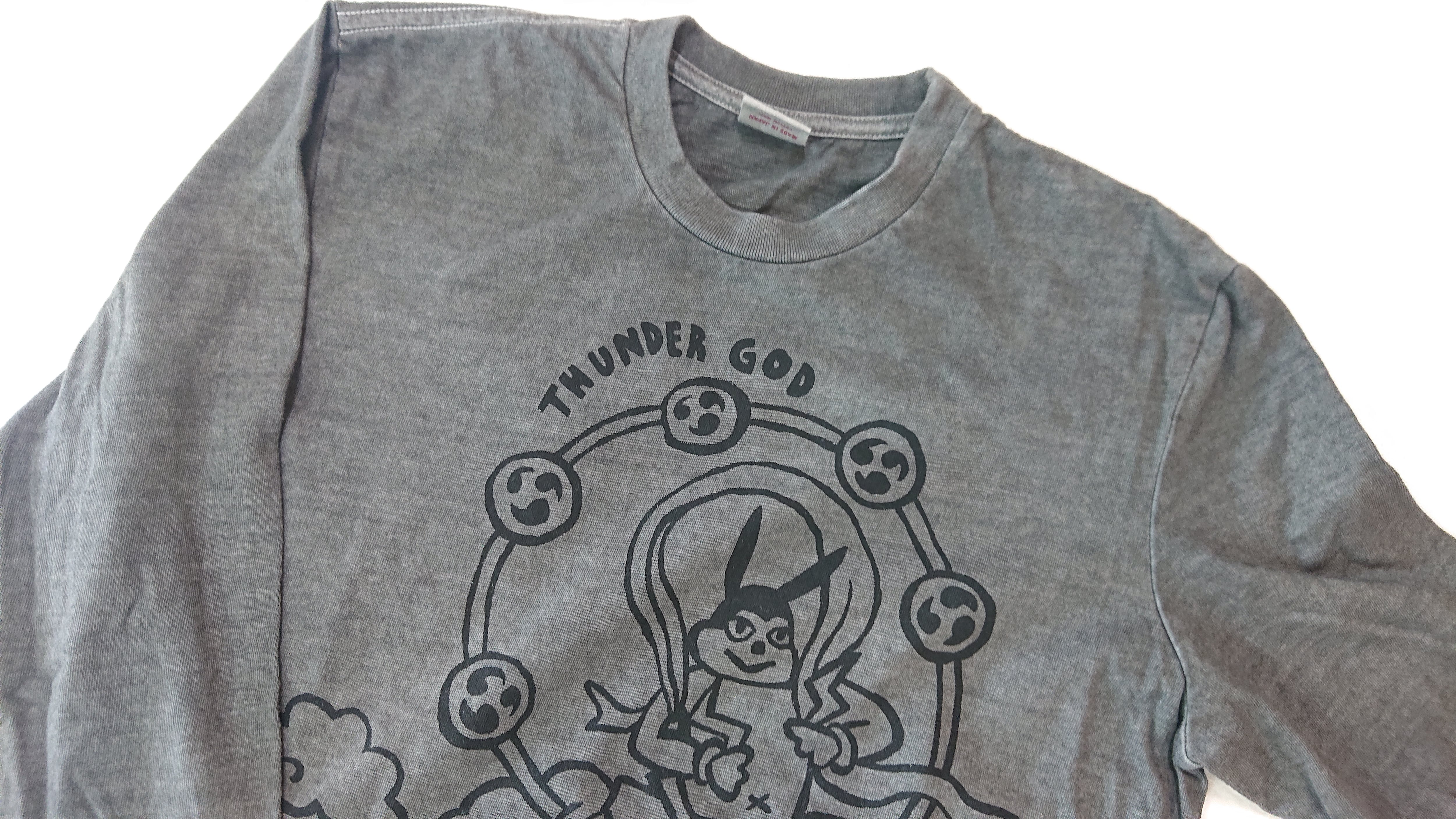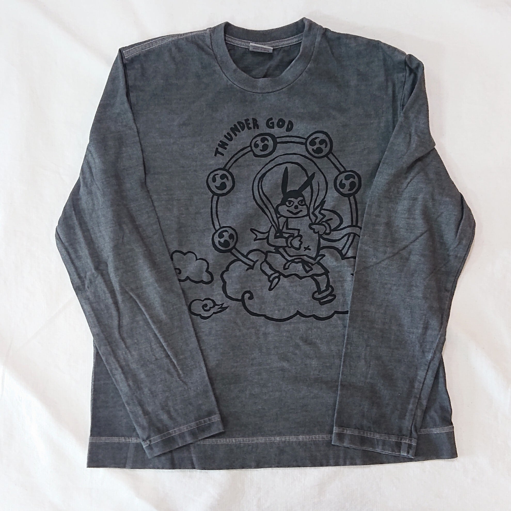 2025秋冬の柄、『風神雷神』。ナッティープリントの風神雷神長袖Tシャツ。 可愛すぎないシンプルな配色と癖のあるタッチが楽しめるデザインに仕上がっています。素材は肌触りに定評のあるオリジナルカットソー生地で、ややすっきりとした着用感。