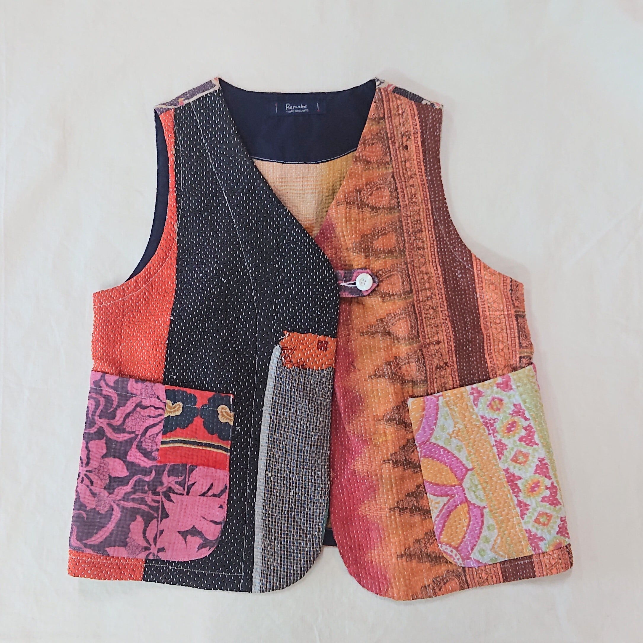 着なくなったサリーの生地を重ねて手作業で一針一針刺し子を施す、インドのカンタ刺繍生地。パッチワーク生地に刺し子が施された特別なファブリックでビッグポケットベストをご用意しました。