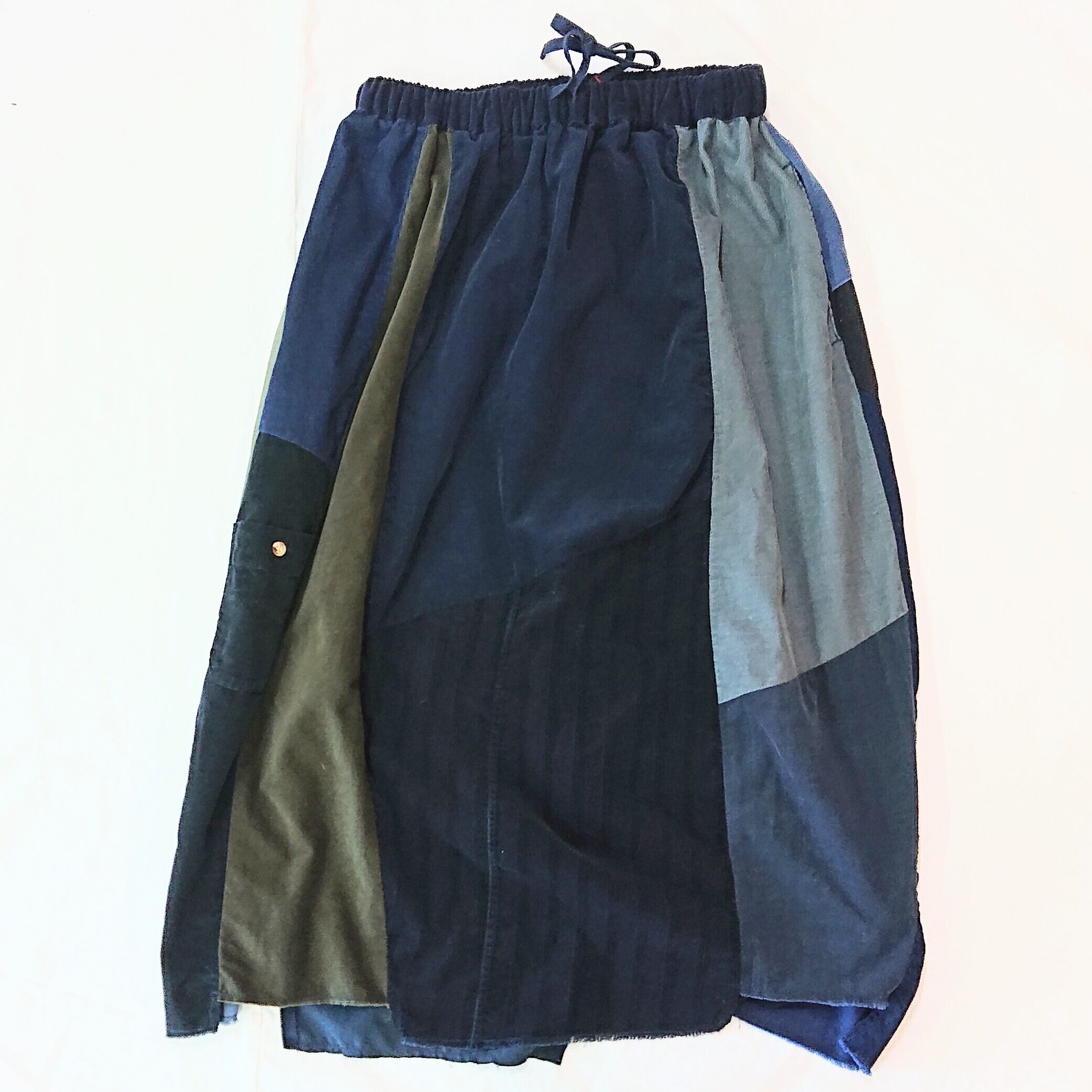 ヴィンテージのユーロコールシャツを解体し再構築。形はランダムパッチロングスカートを仕立てました。ブラウンとネイビーの色合いが少しずつ異なり、コーディネートのポイントになるスカートです。柄物のボトムを主役にコーディネートをお楽しみください。