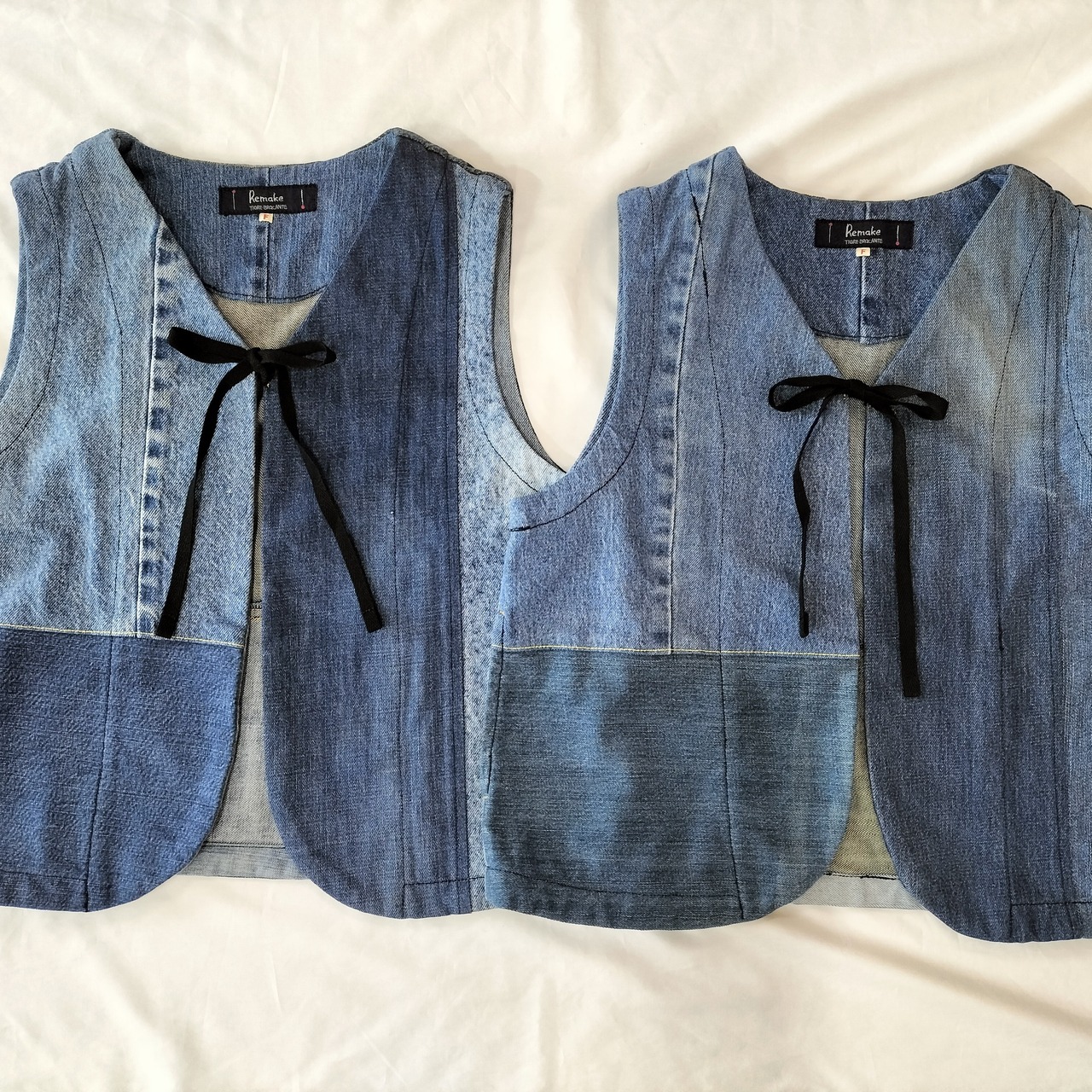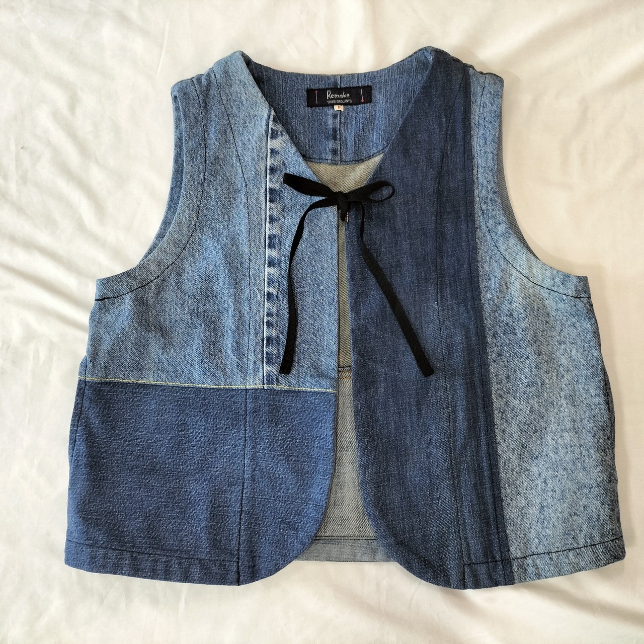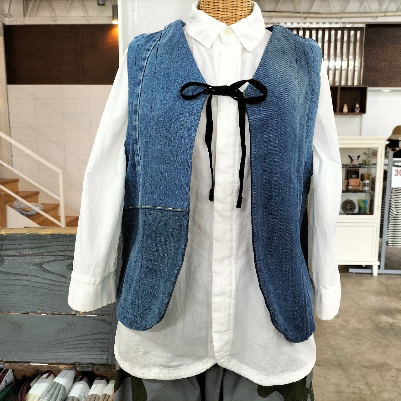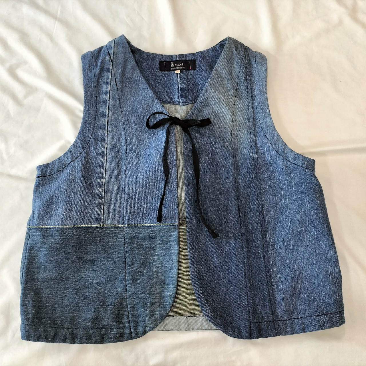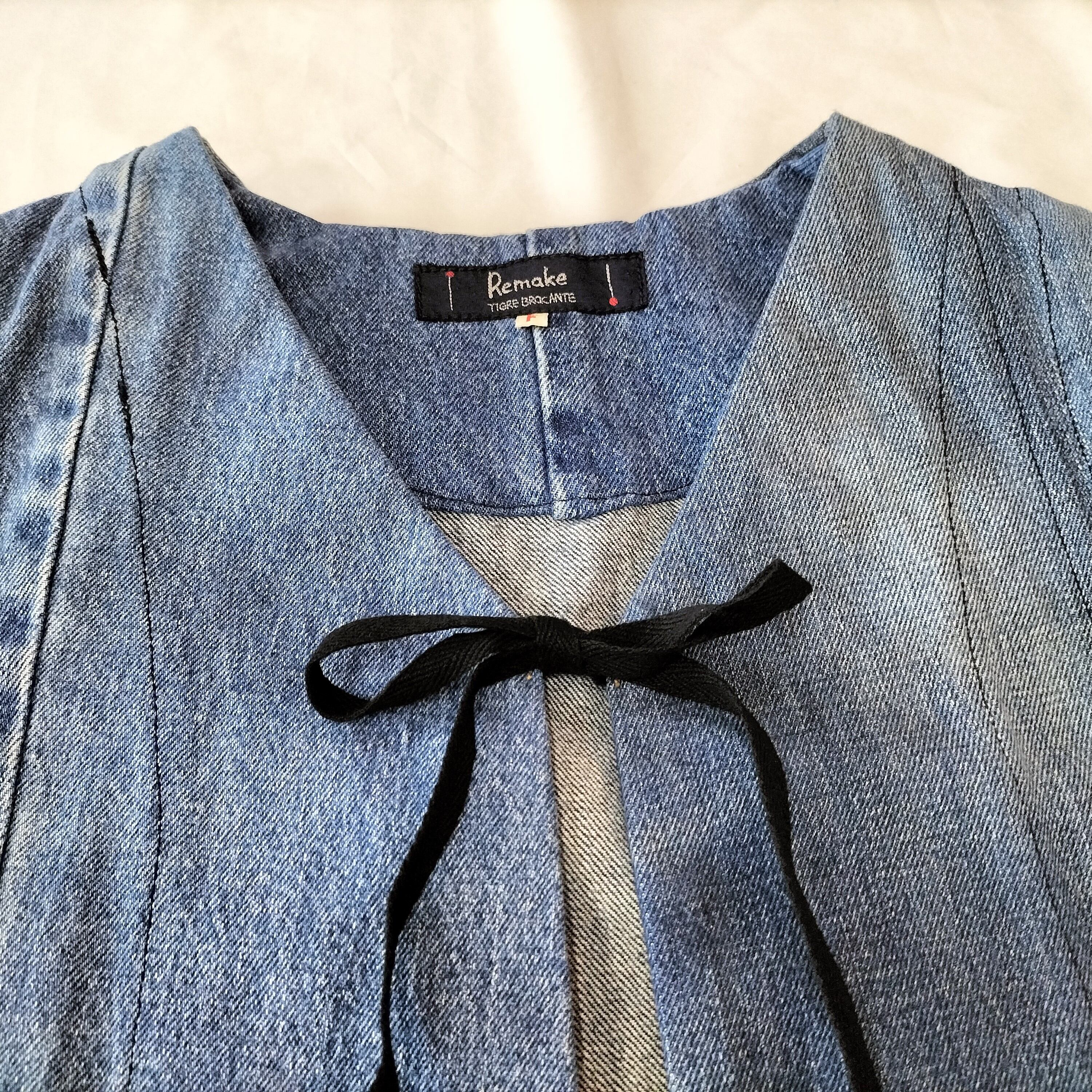 Tigre brocanteのデニムミックスリボンタイショートベスト。