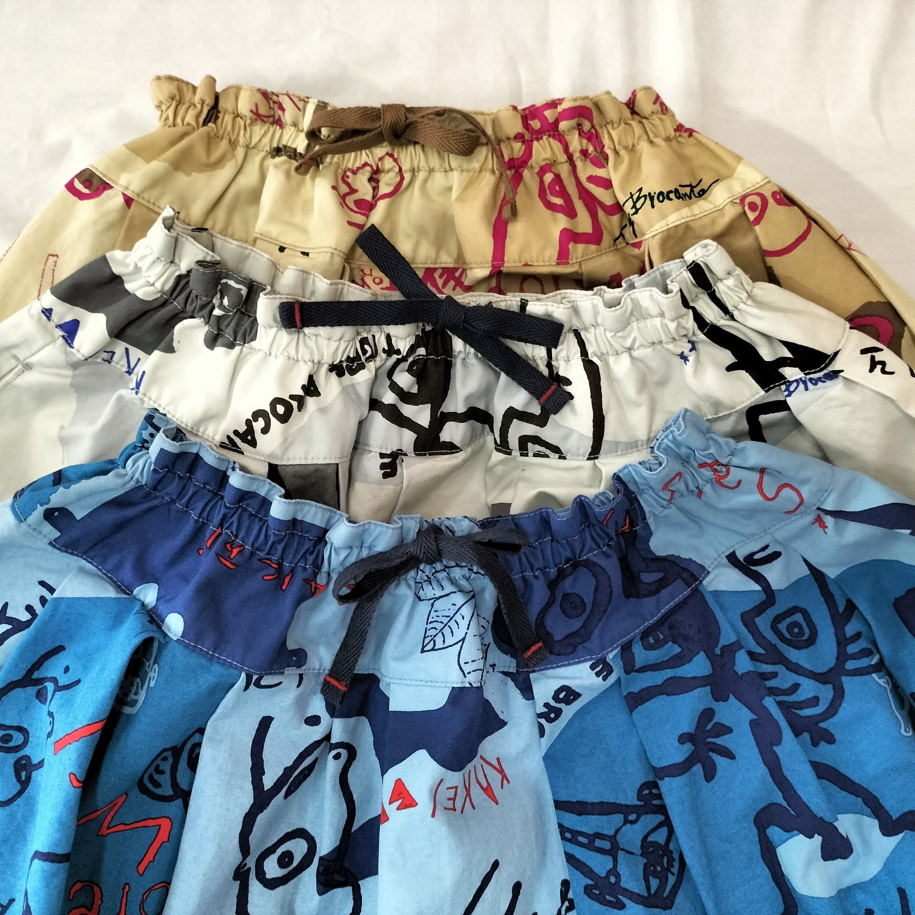 ハリ感と軽さが特徴のウェザー生地に4配色で再構成した手捺染プリントでオリジナルファブリックです。