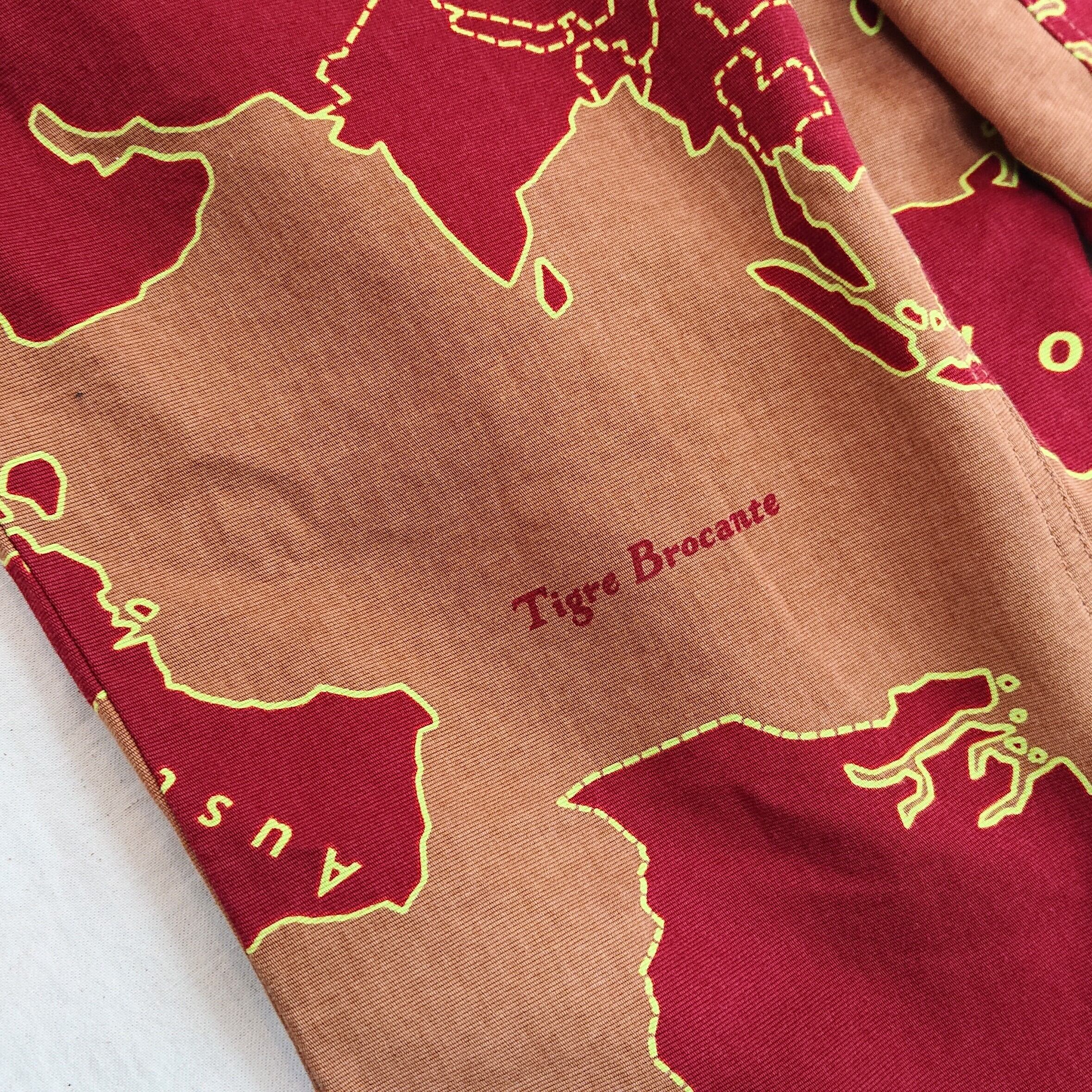 ビンテージの軍用地図や軍用地球儀を元に洋服で着やすいデザインに仕上げたオリジナルの素材。柄の中の数字は大西洋・太平洋・インド洋・北極海・南極海の水深になっており、Make love not war、World is peaceなどの言葉は、軍用地図・地球儀の柄に書き加えることで世界平和を祈るメッセージをを込めています。