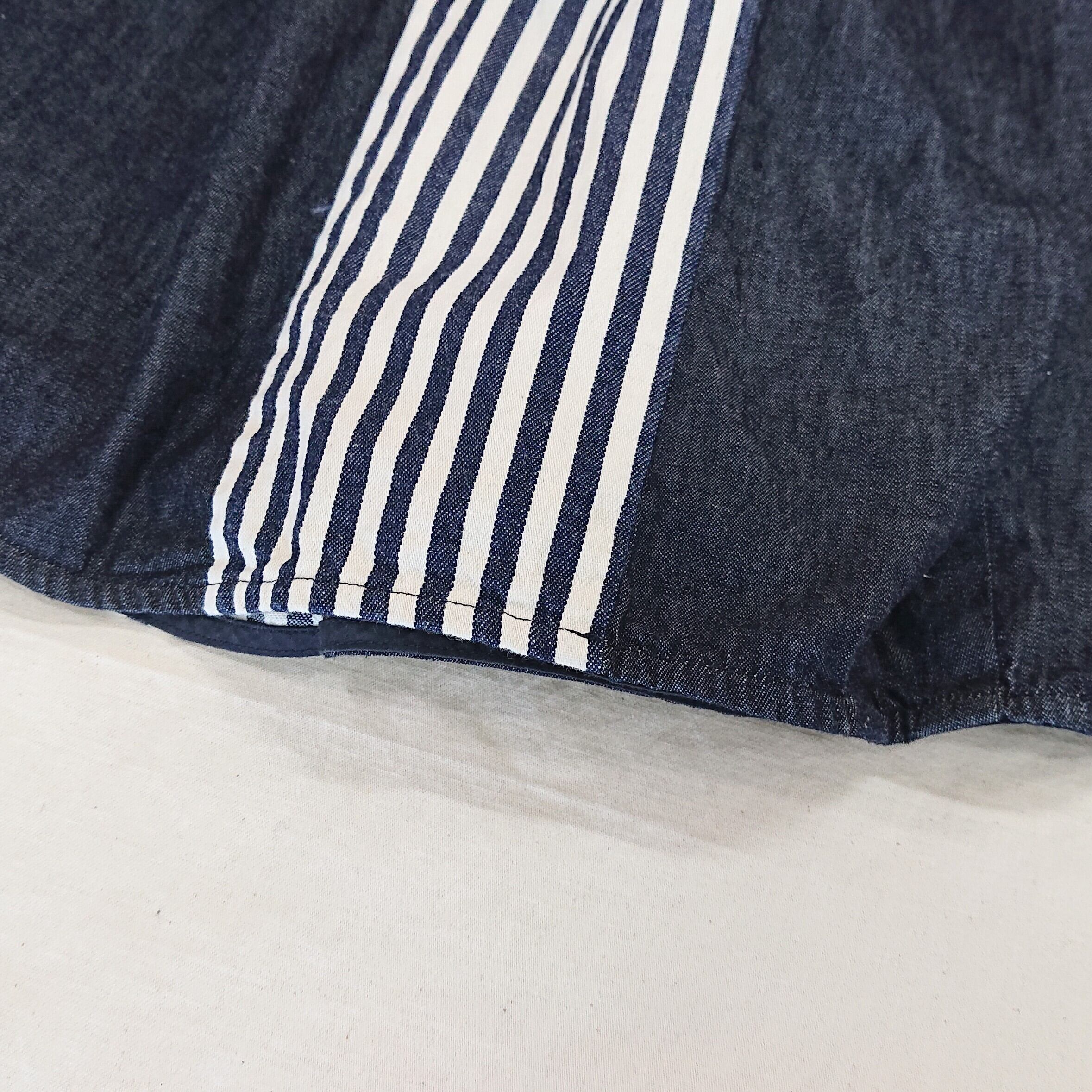 お馴染みの軽く柔らかなデニムとインディゴヒッコリーを組み合わせたバレルスカートをご用意しました。サイドを少しラウンドさせたアシンメトリーなシルエットにたっぷり入ったギャザーの一枚です。